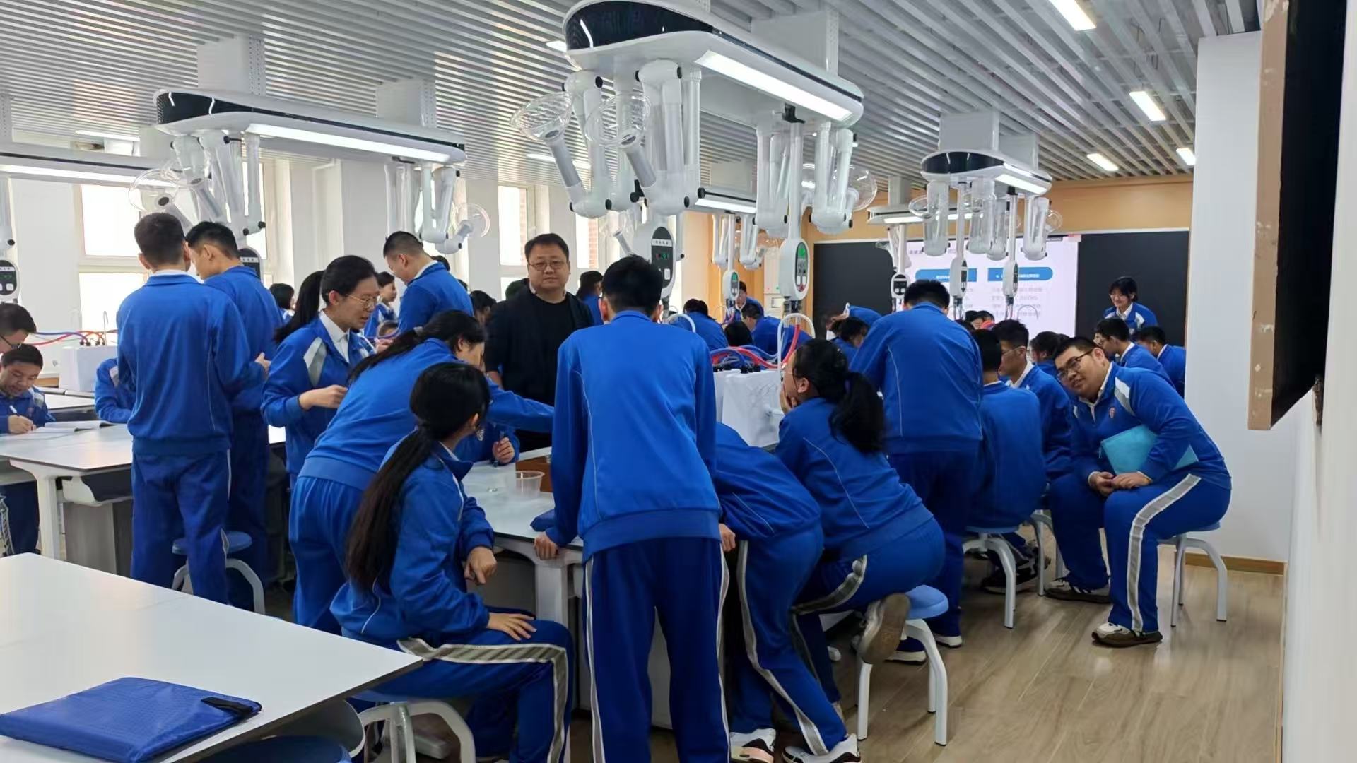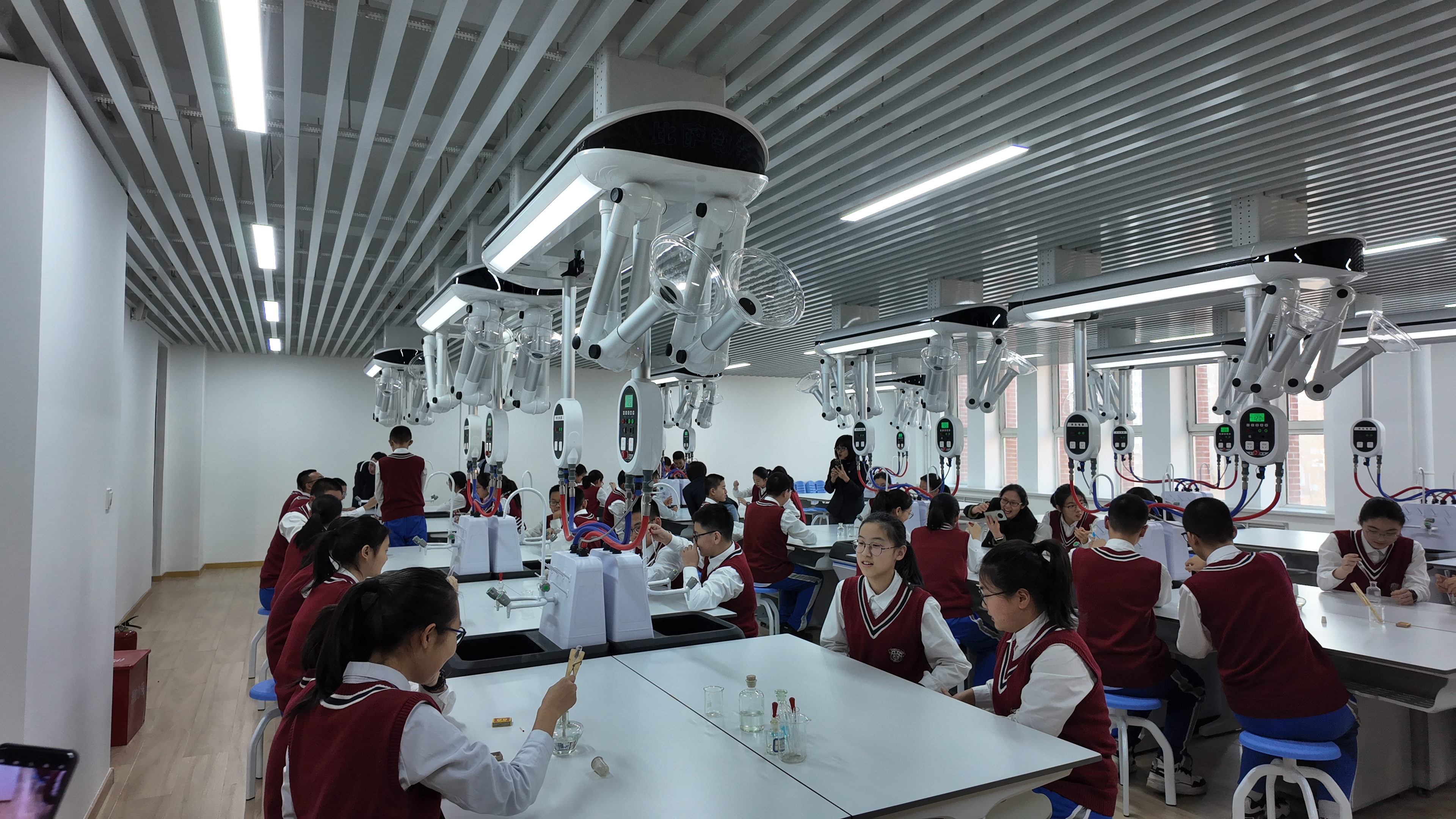 該校將單科實(shí)驗(yàn)室整合升級(jí)為8間標(biāo)準(zhǔn)化綜合實(shí)驗(yàn)室,覆蓋理化生多學(xué)科需求,解決班級(jí)多、教學(xué)集中的難題。實(shí)驗(yàn)室配齊供水、供電、排風(fēng)安全保障系統(tǒng),采用靈活布局適配分組協(xié)作,實(shí)行開放式管理,最大化發(fā)揮空間使用效益。